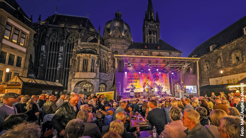 Die Aachener Coverband Pearls sorgt im Elisengarten mit einer energiegeladenen Mischung aus Pop, Rock, Schlager und Welthits für beste Stimmung.