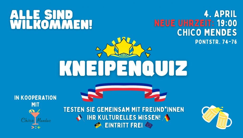 Testen Sie Ihr Wissen zu Themen der deutsch-französischen Freundschaft, zu Europa und natürlich auch zu Frankreich. Es erwarten Sie tolle Preise, ein unterhaltsamer Abend und neue Bekanntschaften!