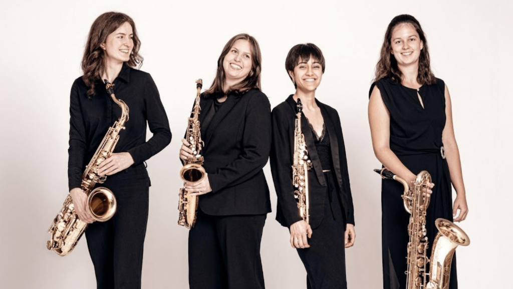 Das ELANSaxophonquartett wurde im Oktober 2024 gegründet und besteht aus den vier Saxophonistinnen Leonor Ferreira (Sopransaxophon), Enja Golob (Altsaxophon), Nele Viehmann (Tenorsaxophon) und Avelina Neye (Baritonsaxophon). Alle vier studieren bei Prof. Daniel Gauthier an der Hochschule für Musik und Tanz Köln. Das ELAN Saxophonquartett ist seit Dezember 2024 in der Förderung von Yehudi Menuhin Live Music Now Köln e.V. aufgenommen worden. Freuen Sie sich auf ein besonderes Konzert eines hochklassigen Quartetts.