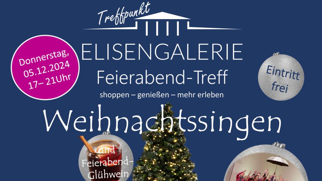 Lust auf Glühwein, Gesang und Shopping? Dann nichts wie auf in die ElisenGalerie. Die Einkaufsmeile im Herzen der Stadt lädt bis März getreu dem Motto Im Sommer trifft man sich draußen – im Winter in der ElisenGalerie einmal im Monat von 17 bis 21 Uhr dazu ein, den Feierabend in entspannter Atmosphäre zu genießen und die Geschäfte an diesem Abend sogar bis 20 Uhr zu besuchen. Passend zur Adventszeit steht der Feierabend-Treff am Donnerstag, 5. Dezember, ganz unter dem Zeichen des Weihnachtssingens. Das heißt, Besucherinnen und Besucher können sich nicht nur auf einen leckeren After-Work-Glühwein freuen, sondern auch auf Weihnachtslieder von Tanja Raich mit ihrem Chor Frameless sowie des St.-Marien-Gesangvereins aus Horbach. Um 17 Uhr präsentiert das Öcher Rät Päck ein kleines musikalisches Vorprogramm mit dem Titel Swinging Christmas. Der perfekte Feierabend in der ElisenGalerie in der Adventszeit!