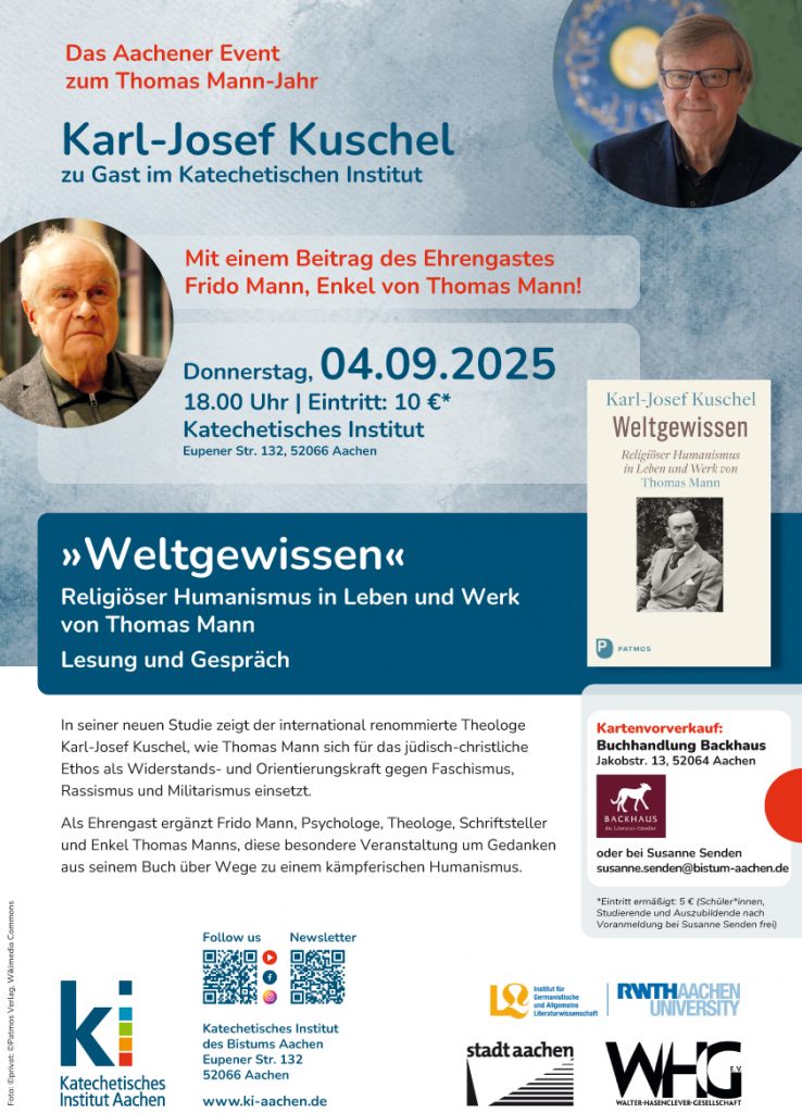 In seinem neuen Buch Weltgewissen. Religiöser Humanismus in Leben und Werk von Thomas Mann zeigt der international renommierte Theologe Karl-Josef Kuschel, wie Thomas Mann sich für das jüdisch-christliche Ethos als Widerstands- und Orientierungskraft gegen Faschismus, Rassismus und Militarismus einsetzt. Als Ehrengast nimmt Frido Mann, Psychologe, Theologe, Schriftsteller und Enkel Thomas Manns, an dieser besonderen Veranstaltung teil und wird Passagen aus seinem aktuellen Buch „Um der Güte und Liebe willen“ Zehn Wege eines kämpferischen Humanismus lesen. Beide Referenten werden ihre Gedanken im Anschluss mit Alexander Schüller (Katechetisches Institut) und Jan Claßen (Germanistisches Institut, RWTH Aachen) sowie dem Publikum diskutieren.