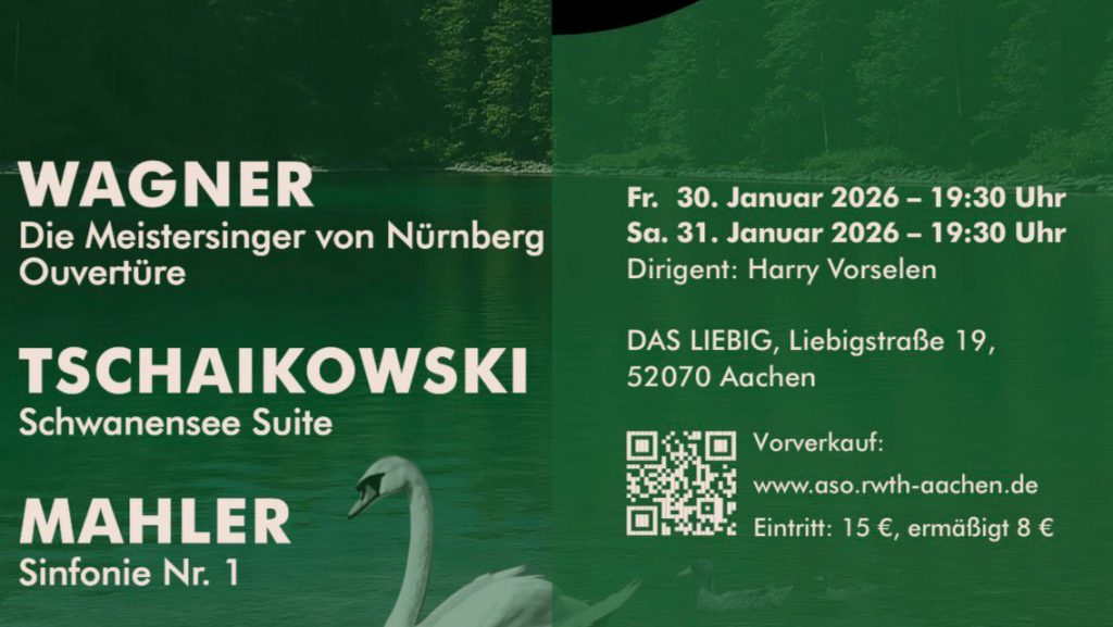 Das Aachener Studentenorchester e.V. wurde im Frühjahr 1989 durch studentische Eigeninitiative als gemeinnütziger Verein gegründet. Wir sind ca. 90 Studierende aus Aachen, die in ihrer Freizeit musizieren. Als Ausgleich zum Studienalltag treffen sie sich einmal in der Woche, um dem gemeinsamen Hobby, der Musik, nachzugehen. Zu hören gibt es: Richard Wagner: Overture aus „Die Meistersinger von Nürnberg“, Piotr Iljitsch Tschaikowski: Suite op. 20a, „Schwanensee“, Gustav Mahler: Sinfonie Nr. 1.