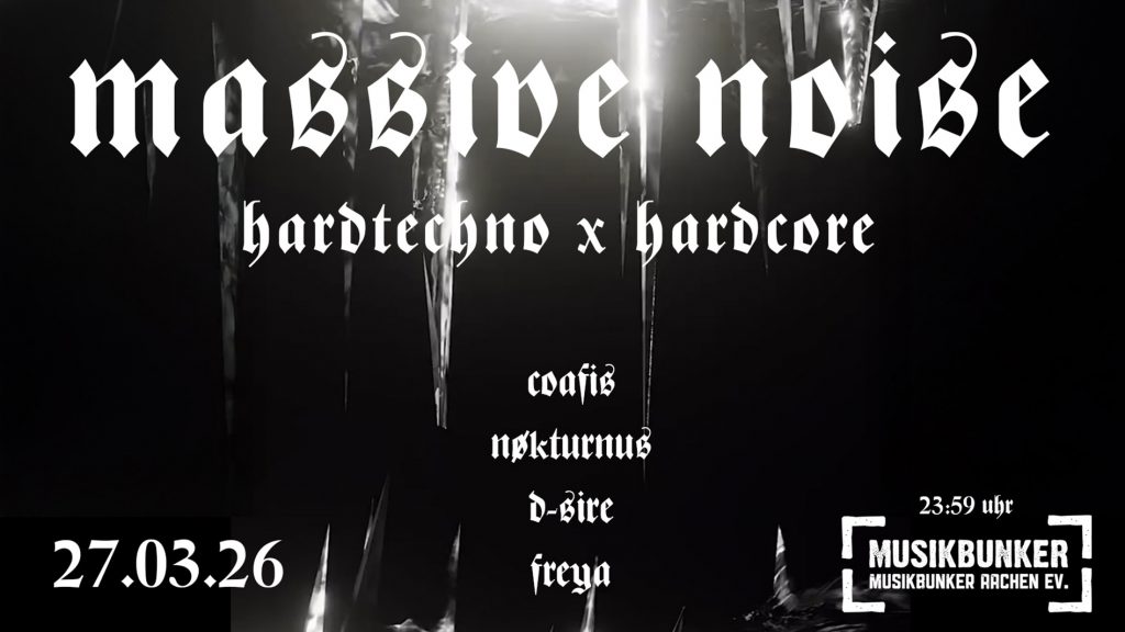 massive noise. Steigt am 27.03.26 gemeinsam hinab in die düsteren Tiefen des Bunkers. Das Aachener Kollektiv Autonomous Gabbers haut euch diesmal Hard Techno und Hardcore um die Ohren. Euch erwarten brachiale Kicks, harte und melodische Sounds. Wir dulden keinerlei Rassismus, Antisemitismus, Homo- oder Transphobie, Sexismus oder andere menschenverachtende Einstellungen.