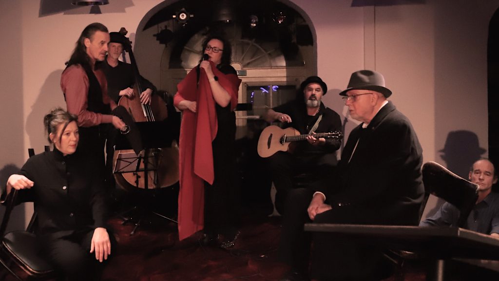 In einer seltsam surrealen Nachtbar treffen sie aufeinander: Schlaflose, Schwätzer & Schwärmer. Und die Band spielt immer den passenden Song, nimmt die Themen der Barbesucher auf. Die Sängerin singt von Träumen, Wünschen und immer wieder vom beunruhigendem Draussen. In neuen, spannungsvollen Arrangements verbinden sich die Lieder und Kompositionen im Dialog mit dem Schauspiel zu einer intensiven Erzählung, die zwischen Traum und Albtraum pendelt.