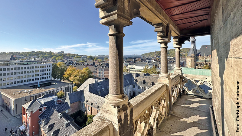Parallel zum Europamarkt für Kunsthandwerk und Design in der Innenstadt laden der Aktionskreis Aachener Dom (AAD) und der Ehrendienst am 6. und 7. September erneut zur beliebten Turmbesteigung ein. Nur einmal im Jahr erhalten Besucherinnen und Besucher die Gelegenheit, die 184 Stufen im westlichen Turm zu erklimmen und die Aussicht auf das Rathaus und die Altstadt zu genießen. Auf dem Weg dorthin geht’s am Thron vorbei, der sonst nur im Rahmen geführter Besichtigungen zu sehen ist. Abrunden lässt sich das Erlebnis mit einem Abstecher ins „Dom-Café“: Der Ausgang über den Kreuzgang führt ins Foyer der Domsingschule, wo die jungen Mitglieder des Domchors und des Mädchenchors mit Kuchen, Waffeln und Crêpes aufwarten.