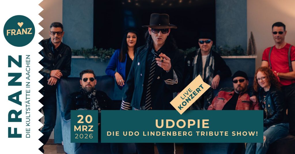 UDOPIE, eine UDO LINDENBERG Tributeband, die abtaucht in die musikalische Welt des Panikpräsidenten. Im Gepäck hat sie Songs aus den letzten 3 Jahrzehnten des Panikorchesters! Energiegeladen und mit einer Menge Spaß nehmen die 8 Musikerinnen und Musiker ihr Publikum mit im Sonderzug des El Präsidentes. UDOPIE, aus dem Herzen Deutschlands, unterwegs im Namen des Rock n Roll.