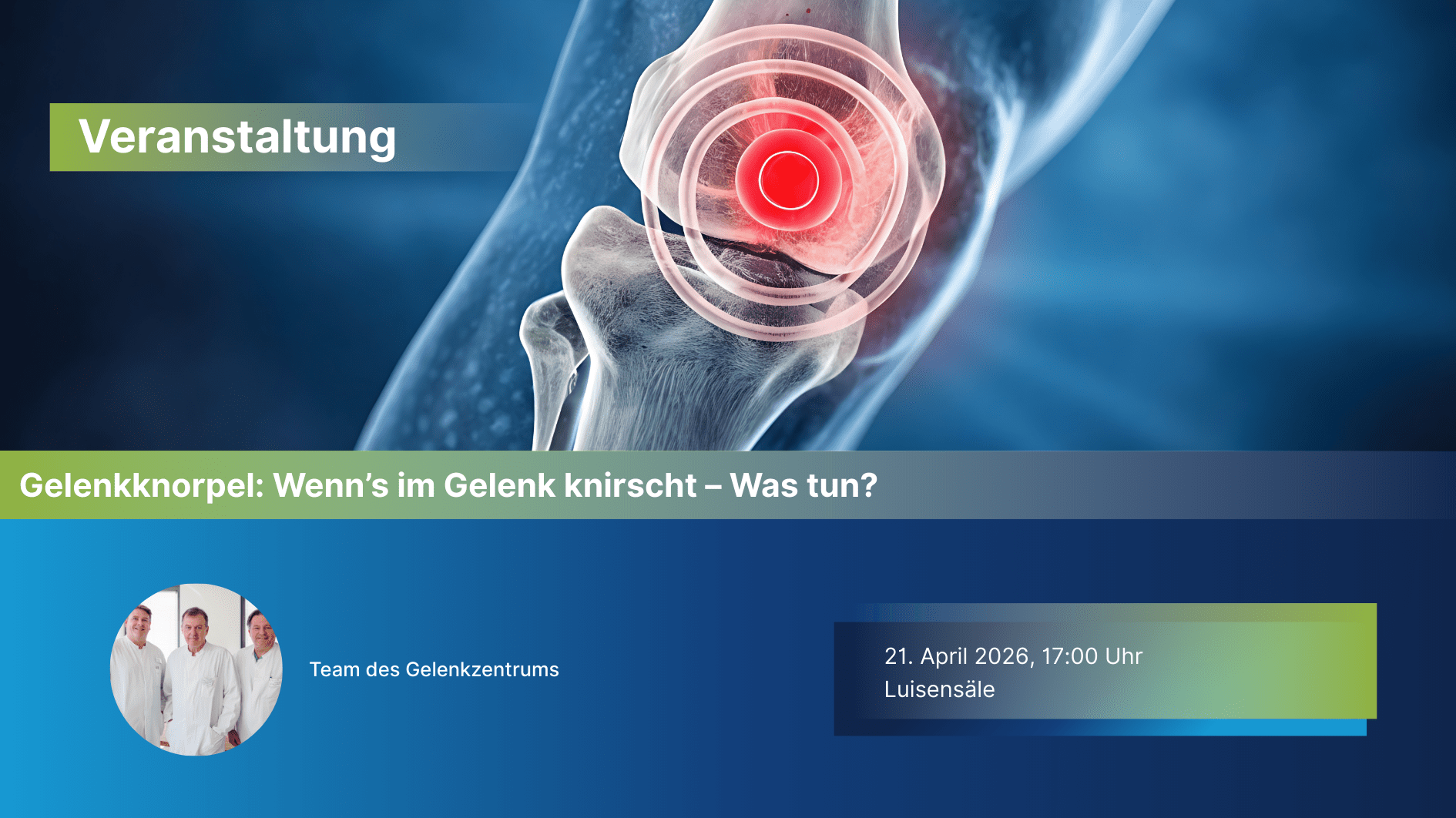 Die beiden Spezialisten und Leiter des Gelenkzentrums, Dr. Arne Driessen und Dr. Iordanis Gissis, stellen den Zuhörern die Möglichkeiten vor, die sie bei Gelenkknorpelverschleiß haben. Es gibt diverse Möglichkeiten, die individuell auf den Knorpel und das Gelenk des Patienten angepasst werden müssen. Im Vordergrund stehen die Therapie- und Behandlungsmöglichkeiten bei Gelenkknorpelproblemen und -schäden. Im Anschluss […]