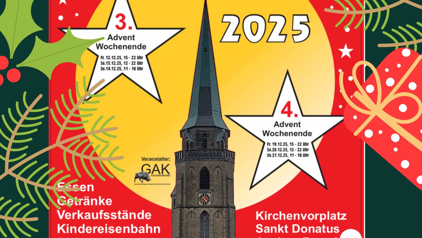 Donatusplatz 1 AachenIm Jahr 2025 öffnet erstmalig das Weihnachtsdorf St. Donatus, Donatusplatz, Aachen-Brand am 3. und 4. Adventwochenende jeweils freitags ab 15:00 Uhr, samstags und sonntags ab 11:00 Uhr die Pforten. Verkaufshütten, gefüllt mit Kunsthandwerk, Handarbeiten, Geschenken, Leckereien und mehr, auch für Tiere, sowie Food-Hütten, eine Kinder-Eisenbahn, eine Glühweinhütte und ein attraktives Bühnenprogramm für Jung und Alt […]